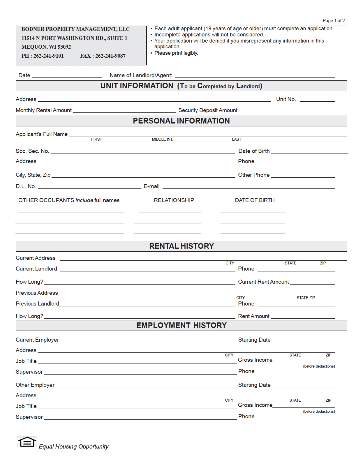 - Application deposit (equal to Security Deposit) in the form of a cashiers check or personal check.